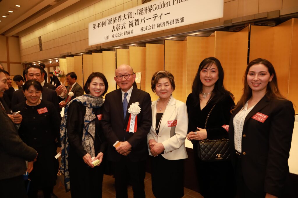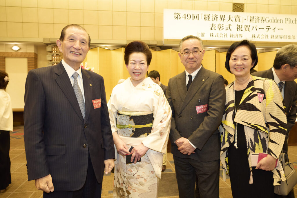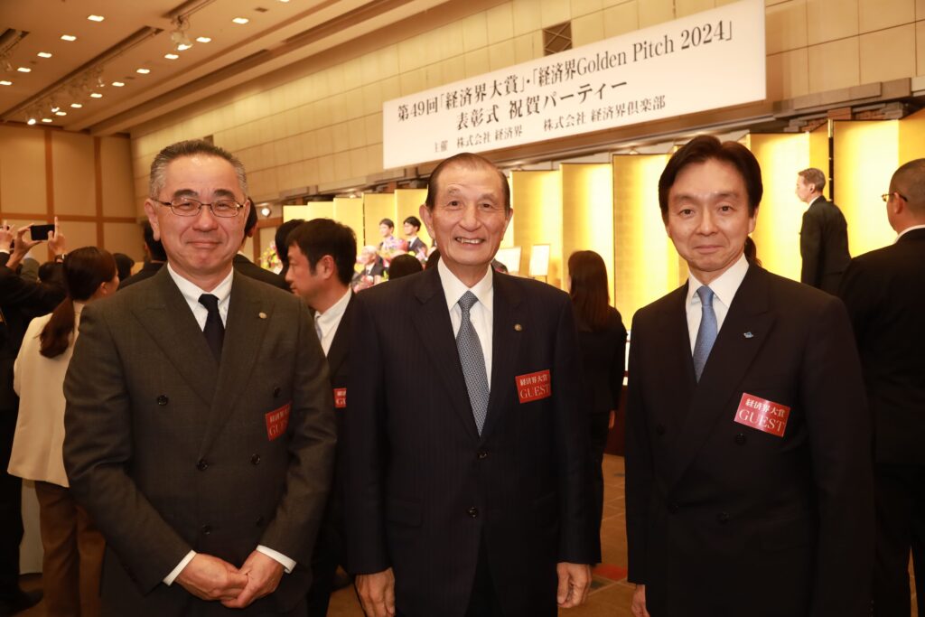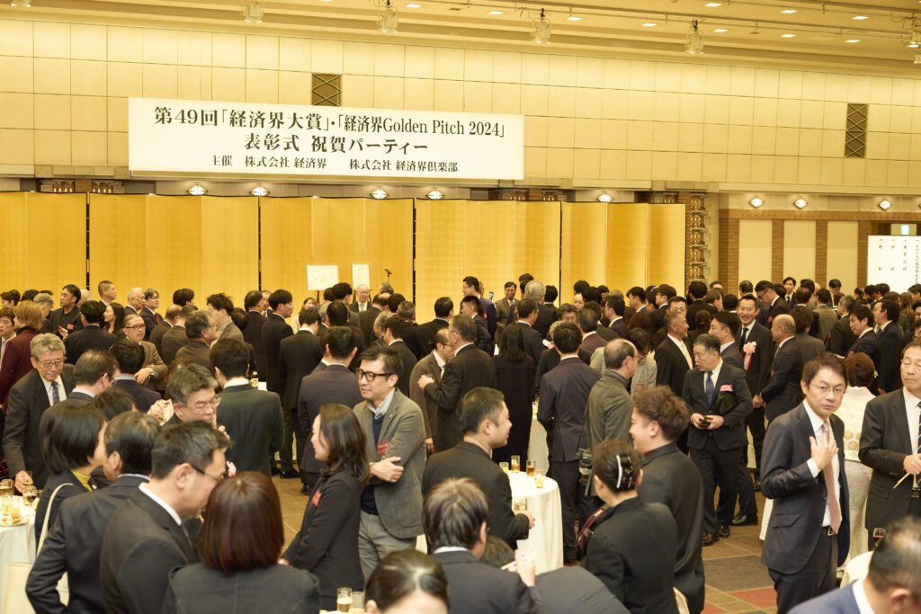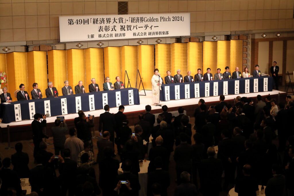 ホーム経済界大賞 第49回経済界大賞・経済界GoldenPitch2024表彰式 祝賀パーティーを開催 2025年1月23日2025年4月24日 第49回経済界大賞・経済界GoldenPitch2024表彰式 祝賀パーティーを2025年1月16日(木)、帝国ホテル(東京)「孔雀東の間」で開催いたしました。 第49回経済界大賞・経済界GoldenPitch2024の受賞者の皆様 開会の挨拶をする佐藤有美 経済界代表取締役 経済界大賞 岡藤正広 伊藤忠商事会長CEO 審査委員長の武藤敏郎 大和総研名誉理事から表彰状を、弊社社長の佐藤有美から花束を受け取る岡藤会長CEO 岡藤会長CEOには副賞として、麦野豪 オフィス麦野代表より高級腕時計「トラベルセトロ」が贈られた 経済界大賞 優秀経営者賞 芳井敬一 大和ハウス工業社長CEO 経済界大賞 優秀経営者賞 森田隆之 NEC社長兼CEO 経済界大賞 地方創生賞 鈴木与平 鈴与会長 経済界大賞 ベンチャー経営者賞 岡田光信 アストロスケールホールディングス社長兼CEO 経済界大賞 ベンチャー経営者賞 髙原幸一郎 NearMe社長 経済界大賞 ダイバーシティ賞 ジュネジャ レカ ラジュ 亀田製菓会長CEO 経済界大賞の講評を述べる武藤敏郎 大和総研名誉理事 経済界大賞審査委員の牛島信 牛島総合法律事務所代表弁護士 経済界大賞審査委員の冨山和彦 日本共創プラットフォーム社長 経済界倶楽部アドバイザリー・ボードの二宮清純 スポーツジャーナリスト 経済界GoldenPitch2024グランプリ 藪 和弥 MOSH Co-Founder / CEO 審査員長の各務茂夫 東京大学大学院工学系研究科技術経営戦略学専攻教授から表彰状を受け取る藪氏 弊社社長の佐藤有美から花束を受け取る藪氏 経済界GoldenPitch2024審査員特別賞 大槻知史 きづなろ代表取締役CEO 経済界GoldenPitch2024審査員特別賞 山田真愛 My Fit代表取締役 経済界GoldenPitch2024審査員特別賞 進藤寛也 エアシェア代表取締役CEO 経済界GoldenPitch2024の講評を述べる審査員長の各務茂夫 東京大学大学院工学系研究科技術経営戦略学専攻教授 経済界GoldenPitch2024審査員の足利駿二 セゾン・ベンチャーズ社長 経済界GoldenPitch2024審査員の石井貴基 千葉道場ファンド代表取締役ジェネラル・パートナー 前列左から、髙原幸一郎 NearMe社長、 ジュネジャ レカ ラジュ 亀田製菓会長CEO、森田隆之 NEC社長兼CEO、岡藤正広 伊藤忠商事会長CEO、芳井敬一 大和ハウス工業社長CEO、鈴木与平 鈴与会長、岡田光信 アストロスケールホールディングス社長兼CEO。後列左から、進藤寛也 エアシェア代表取締役CEO、藪 和弥 MOSH Co-Founder / CEO、大槻知史 きづなろ代表取締役CEO、山田真愛 My Fit代表取締役 昨年の経済界大賞受賞の辻 慎吾 森ビル社長も祝辞に駆け付けた 乾杯の音頭を取る茂木友三郎 キッコーマン取締役名誉会長 会場は、各賞受賞者をはじめ、経済界倶楽部会員、各界著名人など約600人が集い大盛況となった GoldenPitch受賞企業のブースにもたくさんの来場者が訪れた